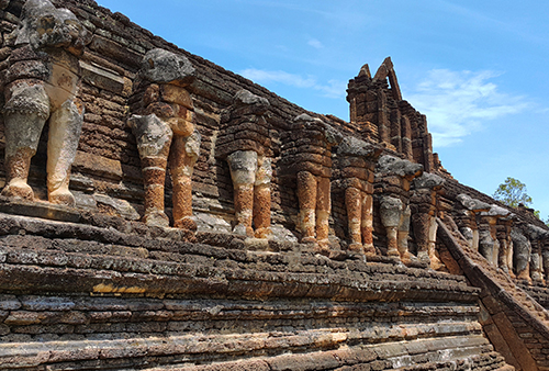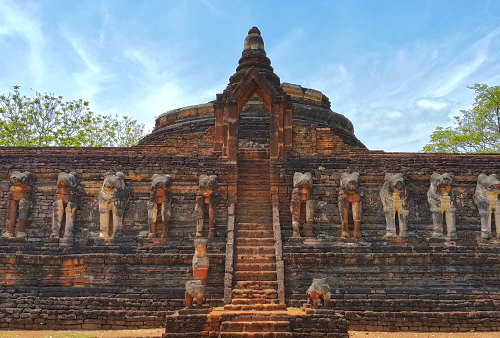 บันไดแคบและลาดชัน ขึ้นลงโปรดระมัดระวัง ผู้กลัวความสูงควรไปเดินรอบฐานเจดีย์เพื่อนับจำนวนช้างทั้งหมด และมองหาสัตว์ต่างๆ ที่ซ่อนอยู่ในลวดลายปูนปั้นรูปต้นไม้ เช่น กระรอก งู รังต่อ