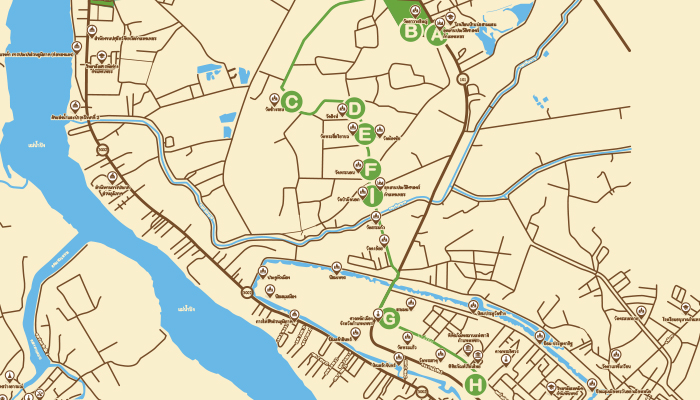 จุด A เริ่มต้นจากทางเข้าอุทยานประวัติศาสตร์กำแพงเพชร ป้อมจำหน่ายบัตร 5 จุด B วัดอาวาสใหญ่ วัดขนาดใหญ่ที่มีผังโบราณสถานจัดวางได้อย่างสวยงาม จุด C วัดช้างรอบ วัดเด่นสุดสง่าที่มีช้างปูนปั้นครึ่งตัวจำนวน 68 เชือก จุด D วัดสิงห์ พระพุทธรูปโกลนตั้งเด่นสง่า บนลานประทักษิณพบใบเสมาแปดใบ มีลวดลายสวยงามน่าชมจุด E วัดพระสี่อิริยาบถ มีพระพุทธรูป 4 องค์ ประดิษฐานอยู่กลางมณฑป คือพระนั่ง ยืน เดิน และนอนจุด F วัดพระนอน ในอดีตคงเป็นวัดที่มีความสำคัญไม่น้อย สถาปัตยกรรมที่สร้างขึ้นด้วยศิลาแลงจึงมีขนาดมโหฬาร วิหารประดิษฐานพระนอนที่แสดงถึงความเจริญในอดีตจุด G ศาลหลักเมืองจังหวัดกำแพงเพชร แวะสักการะติดทองคำเปลว อธิษฐาน ขอพรจุด H ทางเข้าสู่วัดพระธาตุ และวัดพระแก้ววัดพระธาตุ สถาปัตยกรรมโบราณสถาน ศิลปะ วัฒนธรรม ที่ผสมผสานจนกลายเป็นแบบฉบับของศิลปะกำแพงเพชรที่น่าค้นหา วัดพระแก้ว ศิลปกรรมที่ประจักษ์ถึง "เมืองที่แข็งแกร่งประดุจเพชร" การได้มาเที่ยวชมวัดพระแก้ว จึงเท่ากับได้ย้อนอดีตค้นหาประวัติศาสตร์ของเมืองกำแพงเพชรด้วยนั่นเอง จุด I อุทยานประวัติศาสตร์ ประตู 2 ป้อมจำหน่ายบัตร 4 ปั่นจักรยานกลับทางเดิม เพื่อเข้าสู่จุดสิ้นสุดของการเดินทางครั้งนี้
