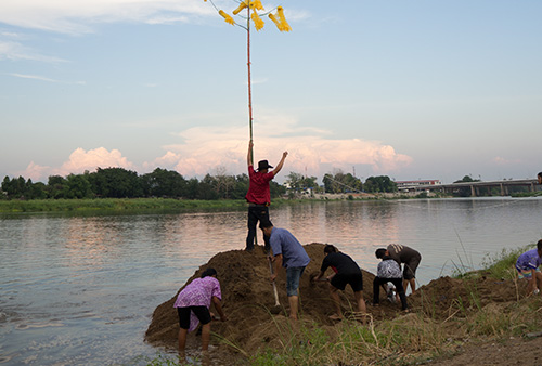 โดยมีการทำนายว่ายิ่งปีใดก่อเจดีย์ทรายจนมีน้ำไหลผ่านครบรอบพระเจดีย์ทรายเร็วเท่าใด ปีนั้นก็จะมีฝนตกมากเช่นเดียวกัน แต่หากปีใดใช้เวลาก่อเจดีย์ทรายจนน้ำไหลรอบเจดีย์ช้าเพียงใด ปีนั้นก็จะแล้งหนักเช่นกัน โดยผู้ที่มาร่วมงานก่อพระเจดีย์ทรายนั้นประกอบไปด้วยชาวบ้านในชุมชน เด็กเล็ก ผู้ใหญ่ภายในชุมชนนครชุม ชาวบ้านริมแม่น้ำปิง พระภิกษุสงฆ์ สามเณร โดยจะมีการนำพระประทานมาตั้งพร้อมกับรอยสายสิญจน์จากองค์พระประทานไปยังยอดของพระเจดีย์ทรายน้ำไหลด้วย ซึ่งชาวบ้านมีความเชื่อว่าหลังจากเสร็จพิธีสามารถนำทรายที่ทำพิธีแล้วนั้นกลับบ้านไปบูชาเพื่อสิริมงคล หรือนำไปโรยรอบบ้านเพื่อป้องกันภัยอันตรายต่างๆ ได้