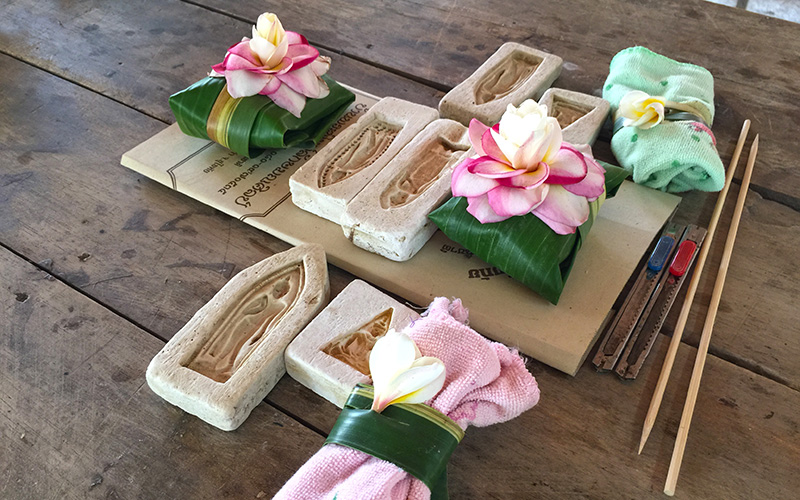 2. ขั้นตอนการพิมพ์พระ แนะนำวัสดุ แม่พิมพ์ อธิบายขั้นตอน ลงมือทำ โดยวัสดุในการพิมพ์พระจะมี 2 ประเภท คือ ดินเหนียว และผงปูน นักท่องเที่ยวสามารถเลือกได้ โดยแจ้งให้ทราบล่วงหน้าก่อน สำหรับพระพิมพ์ประเภทเนื้อดิน หากนักท่องเที่ยวค้างคืนก็อาจจะได้รับพระพิมพ์ที่ผ่านกรรมวิธีการเผาแล้วกลับไปบูชาได้ หากเป็นประเภทเนื้อปูน เมื่อทดลองพิมพ์แล้วจะต้องนำไปตากแดดรอให้แห้ง จึงจะได้เป็นชิ้นงานที่สามารถนำกลับบ้าน และสามารถเป็นของฝากของที่ระลึกได้เช่นกัน