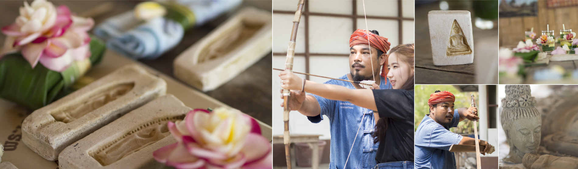 วันทำการ : เปิดทุกวัน (กรุณาติดต่อล่วงหน้าผ่านหมายเลขโทรศัพท์ หรือ Facebook หรือ Line) เวลาบริการ : 09.00-18.00 น.ระยะเวลา : 1 ชั่วโมงค่าทำกิจกรรม : 250 บาท/ท่าน (กรณีมาเป็นหมู่คณะตั้งแต่ 10 คนขึ้นไป กรุณานัดหมายล่วงหน้า และชำระค่ามัดจำล่วงหน้า 30%)การรองรับ : รับได้ตั้งแต่ 1 คน และรองรับได้สูงสุดถึง 60 ท่านกิจกรรม : 1. ฟังบรรยาย คติความเชื่อในเรื่องของพระปรางค์ต่างๆ และพุทธประวัติ พอสังเขป 2. ขั้นตอนการพิมพ์พระ แนะนำวัสดุ แม่พิมพ์ อธิบายขั้นตอน ลงมือทำ โดยวัสดุในการพิมพ์พระจะมี 2 ประเภท คือ ดินเหนียว และผงปูน นักท่องเที่ยวสามารถเลือกได้ โดยแจ้งให้ทราบล่วงหน้าก่อน สำหรับพระพิมพ์ประเภทเนื้อดิน หากนักท่องเที่ยวค้างคืนก็อาจจะได้รับพระพิมพ์ที่ผ่านกรรมวิธีการเผาแล้วกลับไปบูชาได้ หากเป็นประเภทเนื้อปูน เมื่อทดลองพิมพ์แล้วจะต้องนำไปตากแดดรอให้แห้ง จึงจะได้เป็นชิ้นงานที่สามารถนำกลับบ้าน และสามารถเป็นของฝากของที่ระลึกได้เช่นกัน