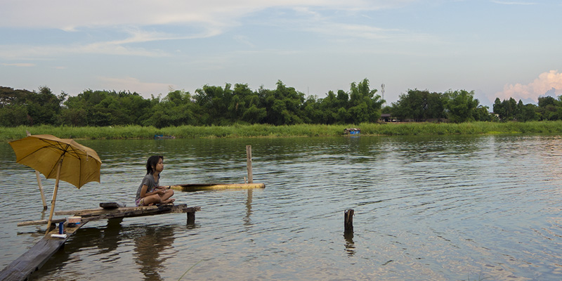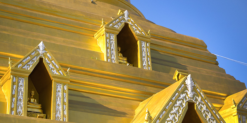 ช่วงเวลาค่ำ 19.00 น. – 21.00 น. หากยืนอยู่ริมแม่น้ำในฝั่งตรงกันข้ามกับวัดพระบรมธาตุเจดียาราม จะมองเห็นองค์เจดีย์แบบพม่าสีทอง มีแสงไฟสีส้มสะท้อนลงพื้นน้ำยามค่ำคืน