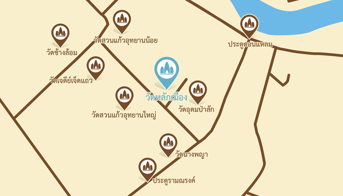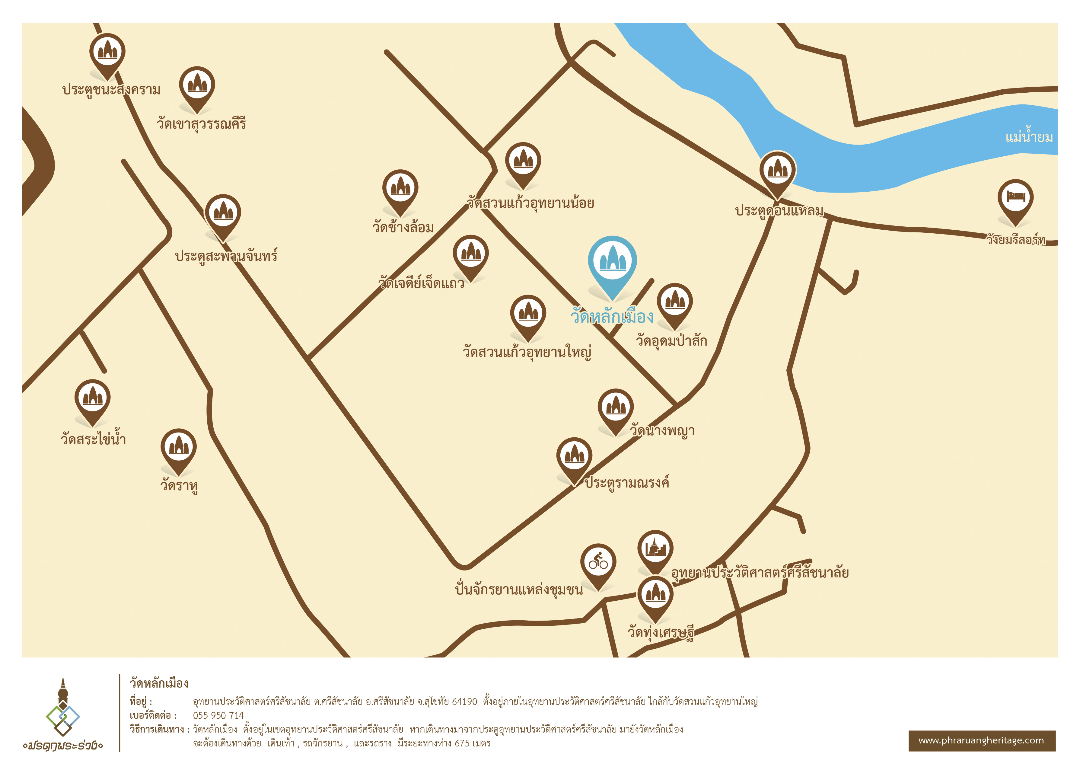 จากอุทยานประวัติศาสตร์ศรีสัชนาลัยเดินทางไป วัดหลักเมือง ซึ่งอยู่ภายในอุทยานประวัติศาสตร์ศรีสัชนาลัย โดยวัดระยะทางจากอุทยานประวัติศาสตร์ศรีสัชนาลัยได้เป็นระยะทาง 675 เมตร