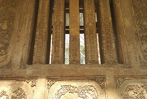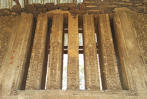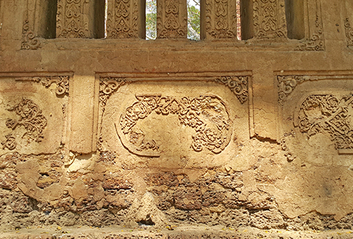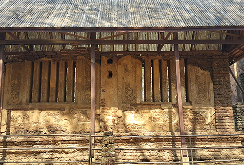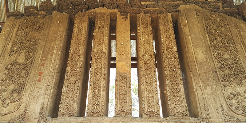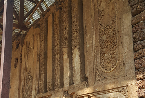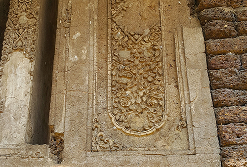 • ผนังพระวิหารที่ยังคงหลงเหลือลายปูนปั้น