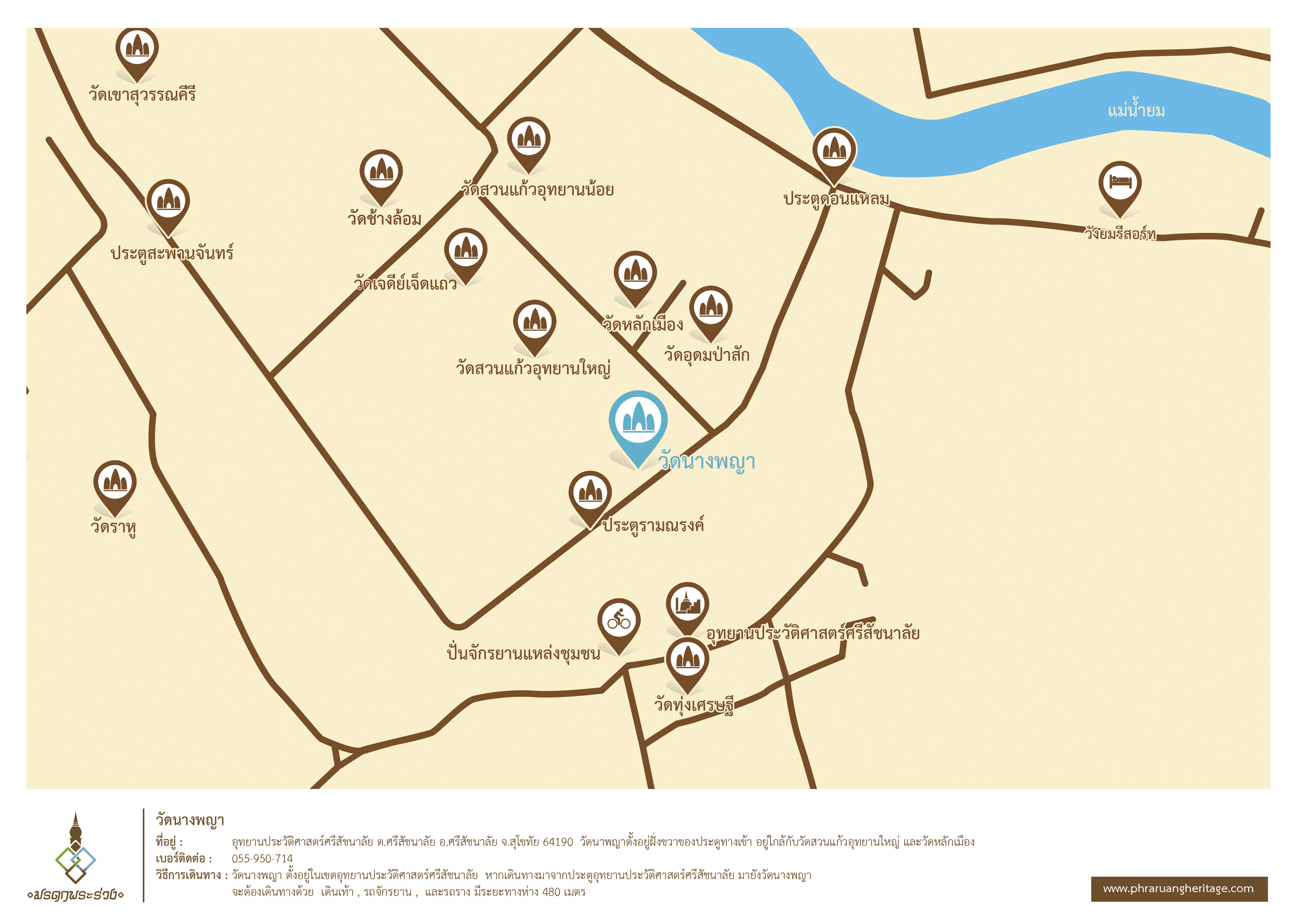 จากอุทยานประวัติศาสตร์ศรีสัชนาลัยเดินทางไป วัดนางพญา ซึ่งอยู่ภายในอุทยานประวัติศาสตร์ศรีสัชนาลัย โดยวัดระยะทางจากอุทยานประวัติศาสตร์ศรีสัชนาลัยได้เป็นระยะทาง 480 เมตร
