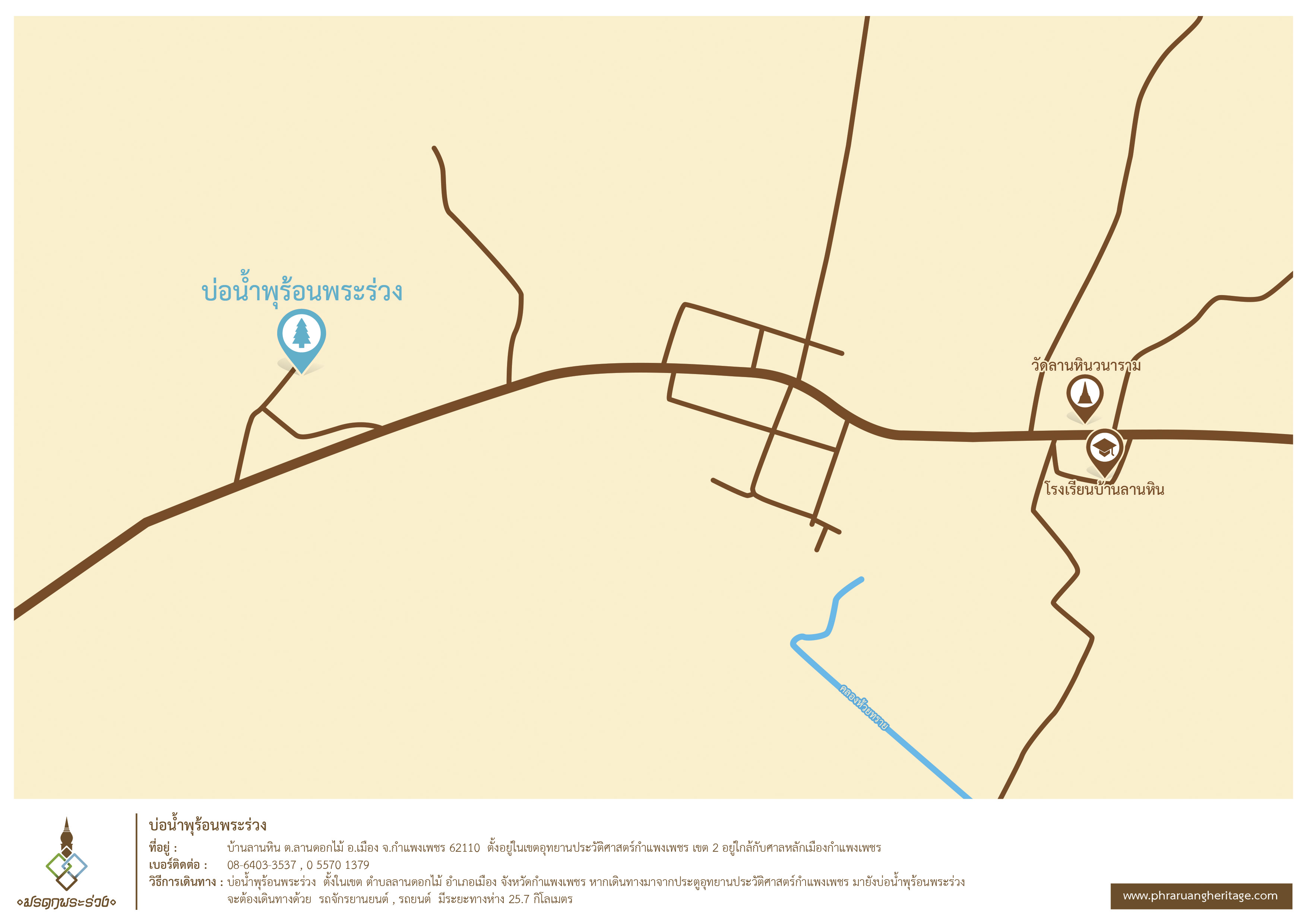 จากอุทยานประวัติศาสตร์กำแพงเพชรเดินทางไป บ่อน้ำพุร้อนพระร่วง ซึ่งอยู่ภายนอกอุทยานประวัติศาสตร์กำแพงเพชร โดยวัดระยะทางจากประตูทางเข้าอุทยานประวัติศาสตร์กำแพงเพชร ได้เป็นระยะทาง 25.7 กิโลเมตร