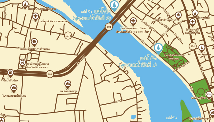 ลำน้ำกว้างใหญ่เป็นแหล่งพักผ่อนหย่อนใจของชาวกำแพงเพชร เหมาะแก่การนั่งชมวิวพระอาทิตย์ตก สองจุดที่สวยงามต่างกัน เพราะมีทัศนียภาพมุมกว้าง หากใช้สะพานแม่น้ำปิง ทางหลวงหมายเลข 101 เป็นแนวแบ่ง ด้านถนนสิริจิตรจะได้ภาพเส้นโค้งสะพานตัดกับท้องฟ้า ส่วนด้านโครงการชลประทานกำแพงเพชรเป็นภาพเกาะกลางน้ำที่เงียบสงบ และบางจุดอาจมองเห็นยอดเจดีย์พระบรมธาตุด้วย